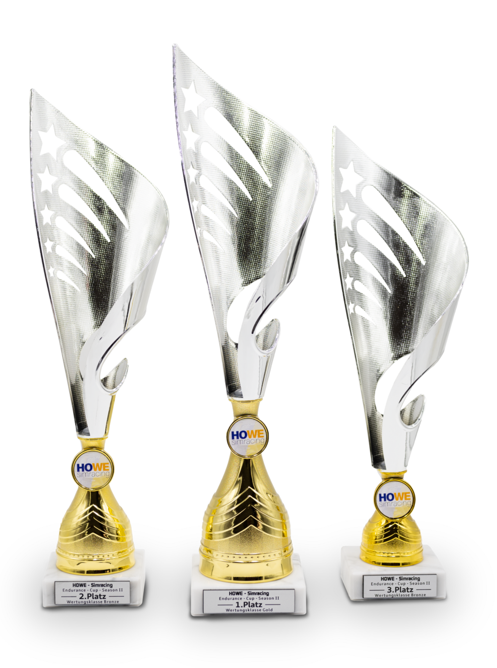 Die ersten 3 Champions einer jeden Wertungsklasse (Bronze, Silver, Gold) erhalten unseren begehrten HOWE simracing Cup - Endurance.